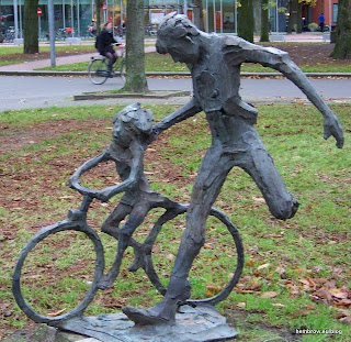 In 1989, "Stop de Kindermoord" changed its name to "Kinderen Voorrang" ("Priority for children"). In 2001 they became part of the larger road safety campaign, 3VO / Veilig Verkeer Nederland ("Safe Traffic Netherlands") who continue to campaign for lower road deaths. The statue in the photo is "Fietsles" ("cycling lesson"), by Kees Verkade. It's in Groningen, here.