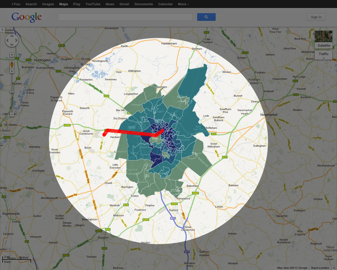 | The same 20 km radius around Cambridge showing how even adult commuter cycling drops rapidly to below 5%. The red line shows the route that a 14 year old boy in a village could not take to get to school. Seemingly no-one thought it reasonable to suggest that he cycled. I've cycled there myself in the past and I wouldn't have suggested it either. Whatever the quoted statistics say, there is an enormous difference in the ease of cycling between Cambridge and Assen. |
