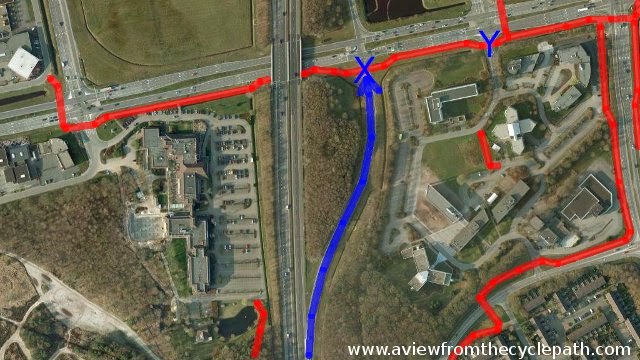 | Red shows cycle-paths, blue shows the direction from which cars are leaving the motorway at this junction. X and Y are two junctions which default to green. The video was made at position X. The area covered by this map is only about 500 m wide. Cycling infrastructure has to be built at a very high density in order that it is useful. At the western end, the cycle-paths link with little used service roads. To the east they are unbroken to the centre of the city. |