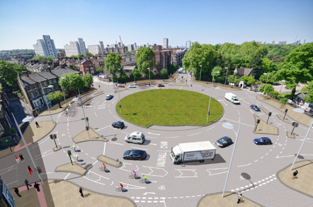 | Update May 2015: One that I'd missed which is so awful in design that it really must be listed here. A redesign for Queen's Circus Battersea roundabout which is actually under construction. In some places this has been described as "Dutch", but it's very far from any real design for a Dutch roundabout. This junction is also far too busy for a Dutch roundabout design so in the Netherlands this junction would in fact use traffic lights instead. As we can see form the photo, traffic lights are actually installed, so this won't flow freely like a roundabout. I'm assured that the cycling infrastructure under construction is actually narrower than that shown in the picture. Update July 2015: Watch a video which demonstrates this roundabout in action. Enormously long delays for cyclists, combined with red jumping by drivers which puts cyclists in danger even after they've waited for a green light. |